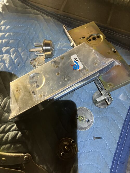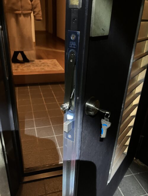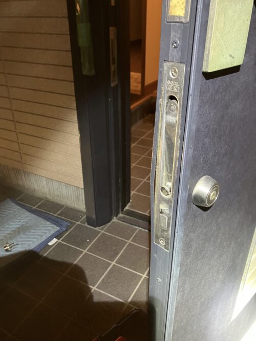 こちら遅い時間からの依頼 鍵が半分しか回らない?ドアーが開かない? 入れない?と言って電話を頂きました。築30年位だそうです。良く有るケースです(ガードロック) 月に7~8件くらいあります