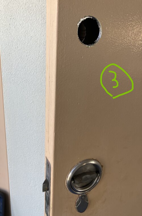 こちら某マンションの機械室 鍵を無くして開けれない?開けて上側に新しく取り付けてほしいと言って電話を頂きました。 他社で見積り取ると100000円(税別)と言われたそうです。 当店は40000円(税別)を提示 ご依頼頂きました。